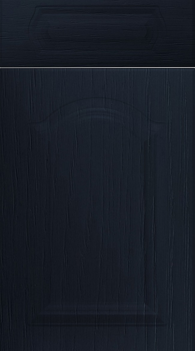 Sherwood is a cathedral-arch door with a shaped central panel and matching drawer front, bringing heritage character and decorative detailing into the kitchen. Its curved profile offers a traditional focal point with enduring appeal. In Indigo Ash, Sherwood feels rich and refined, with the deep tone adding contrast and sophistication while enhancing its ornate form. The ash woodgrain effect highlights the curves with tactile texture and depth. Sherwood in Indigo Ash is perfect for kitchens that celebrate classic craftsmanship while embracing bold colour for a distinctive and timeless interior.
