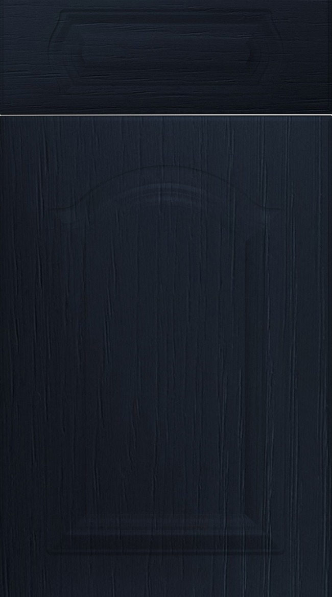 Sherwood is a decorative cathedral arch door with a profiled central panel and matching drawer front that brings elegance and traditional charm into the kitchen. The arched shape softens the overall look while adding heritage character. In Navy Blue Ash, the deep blue tone gives the design a modern lift, creating a striking contrast with the classic form. The ash embossed woodgrain effect adds texture and surface depth for a richer finish. Sherwood in Navy Blue Ash suits kitchens that want ornate detailing balanced with confident contemporary colour and lasting visual impact.